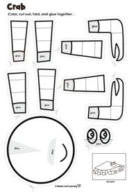 Directions: Color and cut out the crab’s body, legs, claws, and eyes. Fold the legs and claws inwards on the dotted lines to create a 3D effect. Fold the body over on itself on the dotted line from the center to create a wedge, and glue it down to create a conical body shape. Glue the arms and legs to the body so it stands up. Fold the eyes at the dotted line and glue to the top of the body, and sing The Beach song with your new friend!