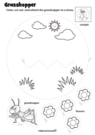 Directions: Color the grasshopper, flowers, and scene. Cut out all of the items. Cut a slit in the middle of the scene. Tape the grasshopper on to a straw or chopstick and slide it through the slit. Pull up and down on the straw or chopstick to make the grasshopper jump!