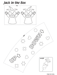 Directions: Color and cut out. Glue or staple the Jack onto a straw. Glue the Up and Down section onto a cup. Punch a hole in the bottom of the cup. Slide the straw down into the hole. Sing along with the “Jack in the Box” song.