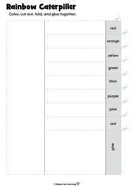 Directions: Color the caterpillar’s head, antennae and body. Cut out the body, fold and glue together. Glue on the head and antennae.